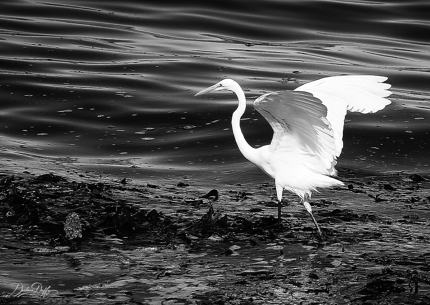 HERON ON WATER B&W